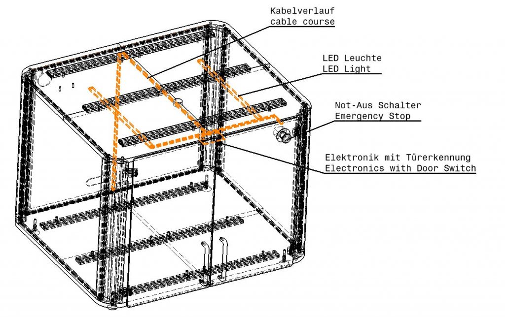 Die LED Beleuchtug wird mit dem Verbinden des USB Kabels automatisch aktiviert. Damit die LED Beleuchtung und die Erkennung der Türposition funktionieren, muss die Elektronik wie in der folgenden Anleitung beschrieben, angeschlossen werden.