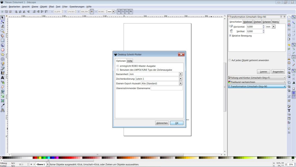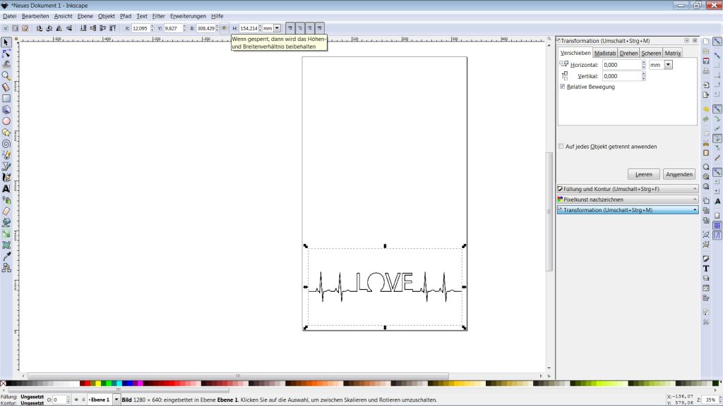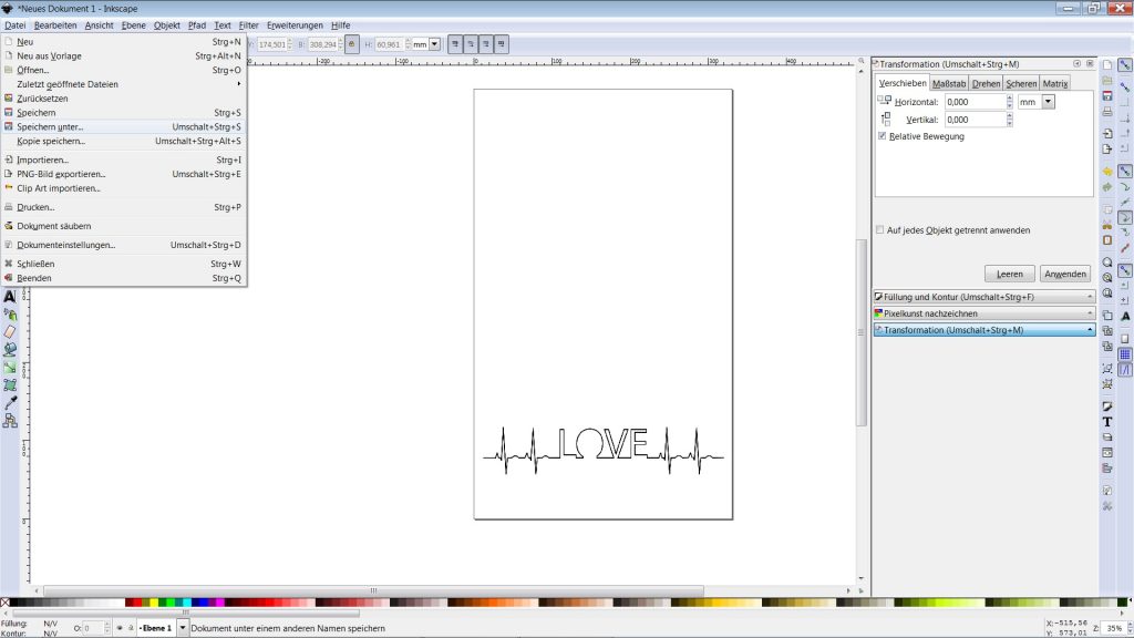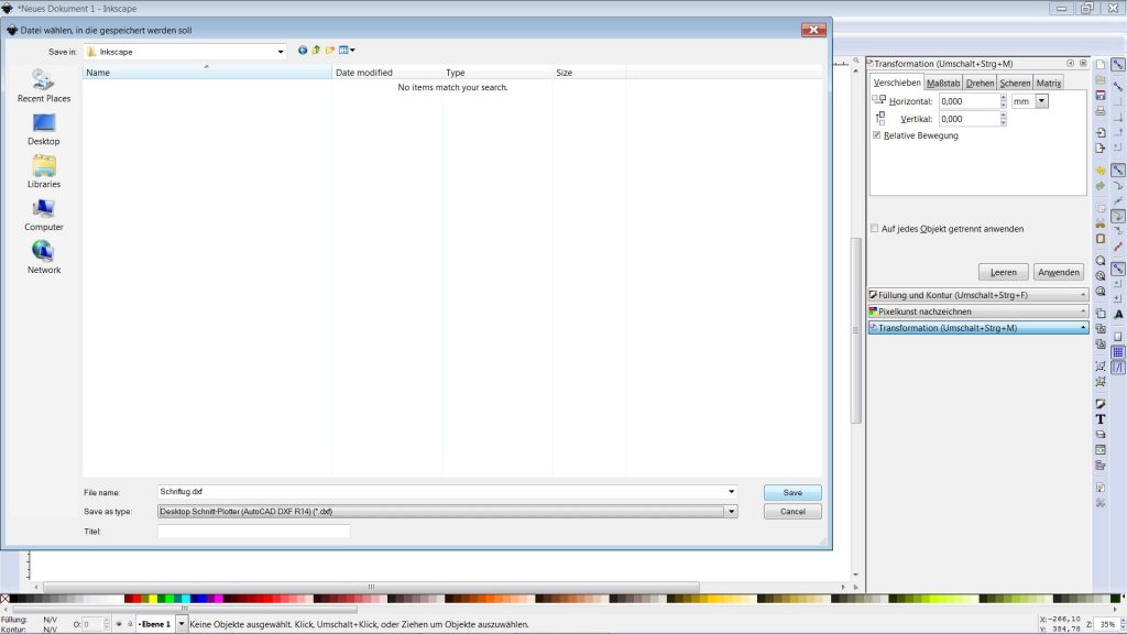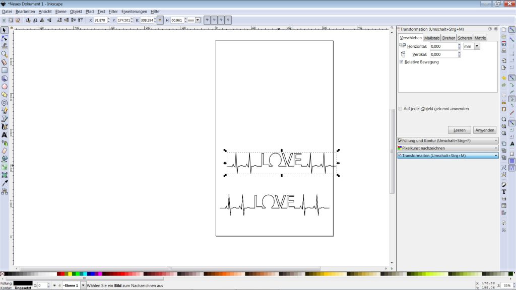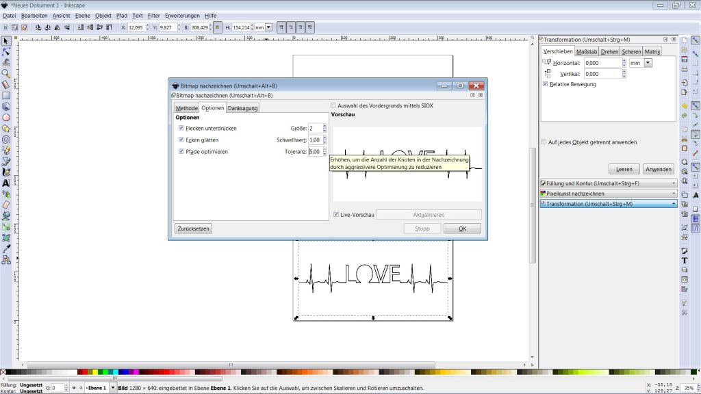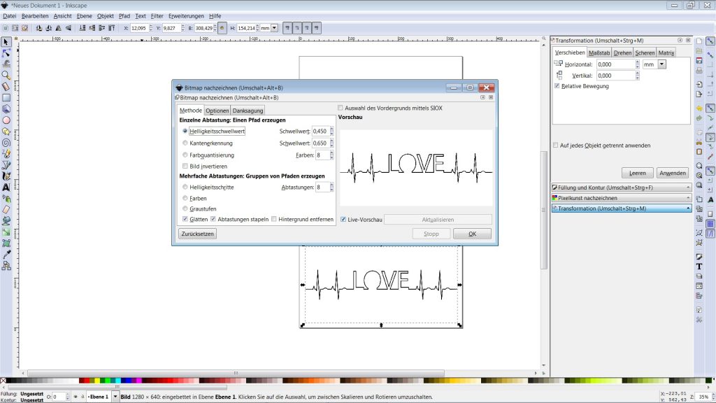 nkscape legt die angenäherten Pfade über die Originalbilddatei. Wir empfehlen die Originalbilddatei vor dem Export zu löschen. Sollte später im DXF die Umrechnung mit der Fehlermeldung „Objekt zu groß“ sofort enden – so ist anstelle der Pfade die Bilddatei im DXF.