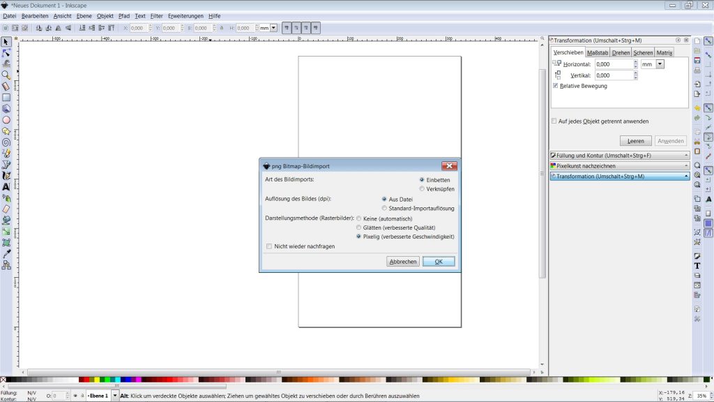 • Importieren Sie die Bilddatei in Inkscape. Meist ist es besser die Genauigkeit auf Pixelig zu stellen, da ansonsten später die DXF Datei sehr groß wird. In der späteren Umrechnung wird intern die Bilddatei aufgebessert.
