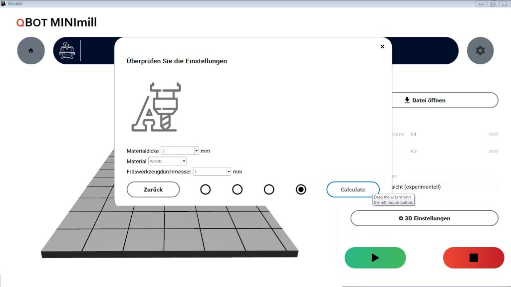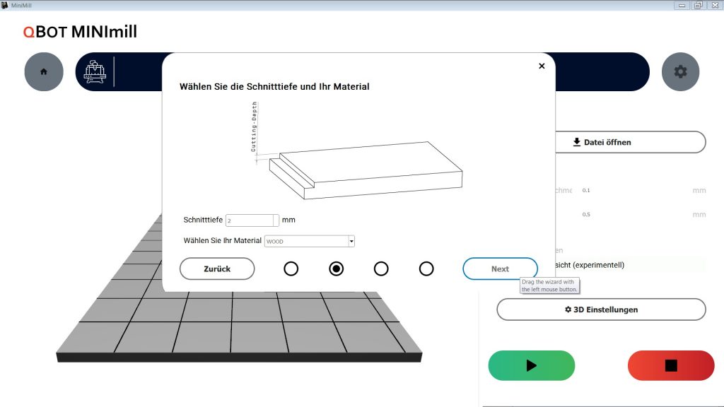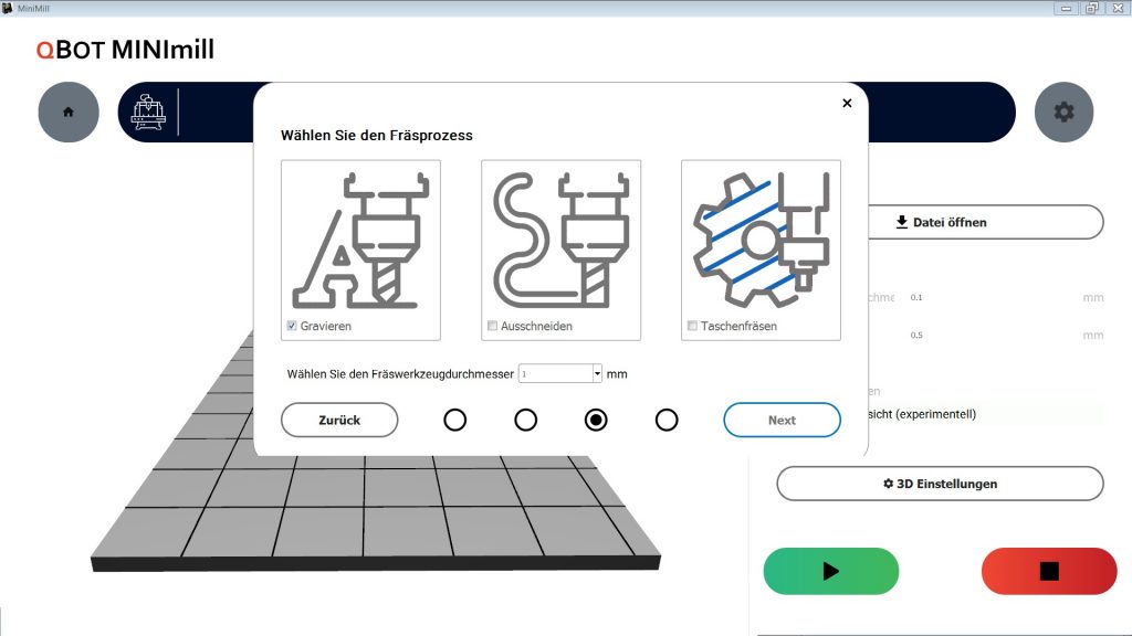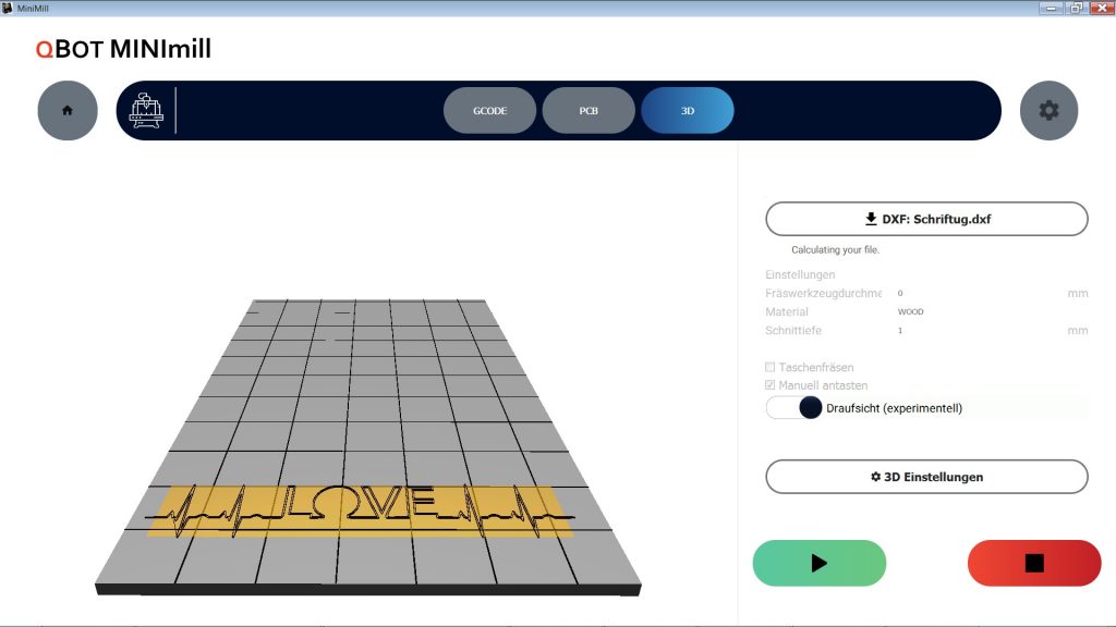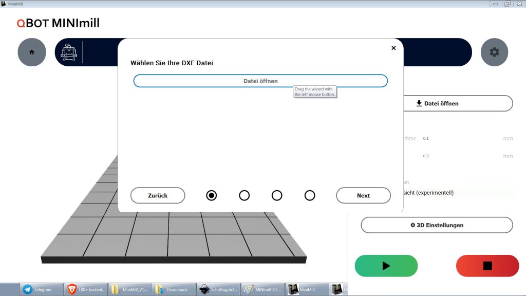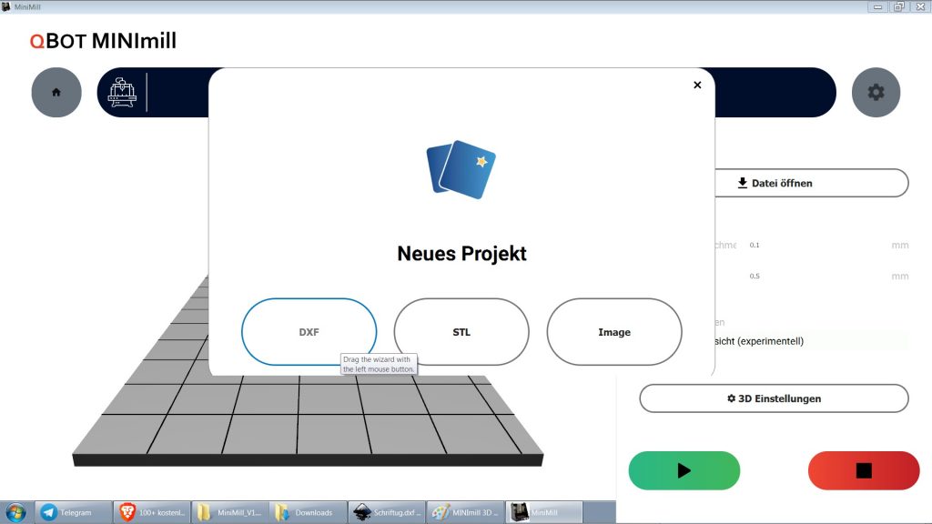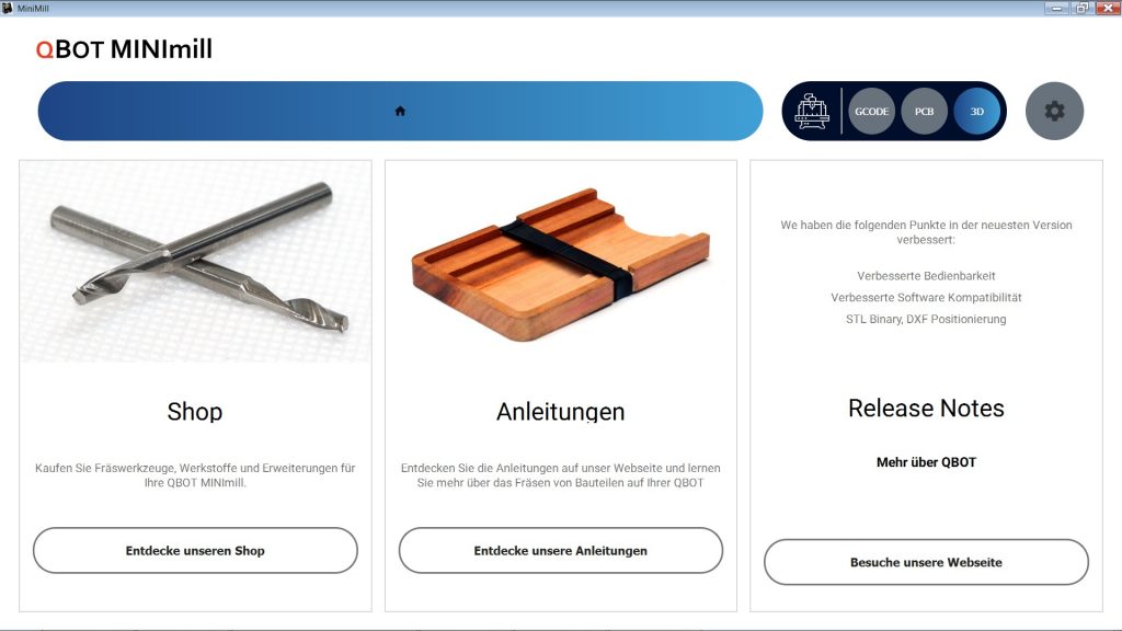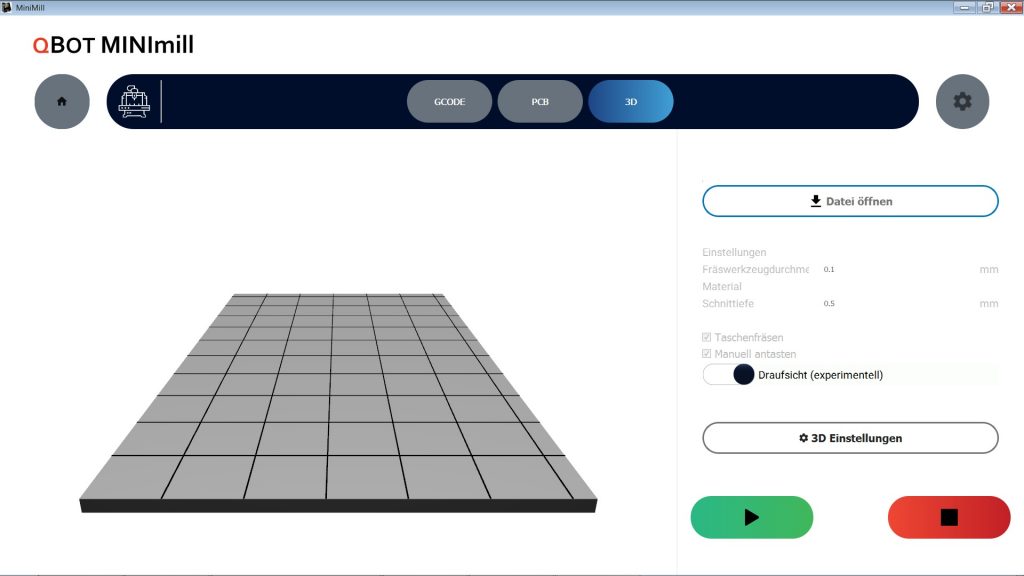 Öffnen Sie die MINImill Software und gehen Sie in den 3D Modus. Sie können die Software ohne Fräsmaschine im Testmodus freischalten.
