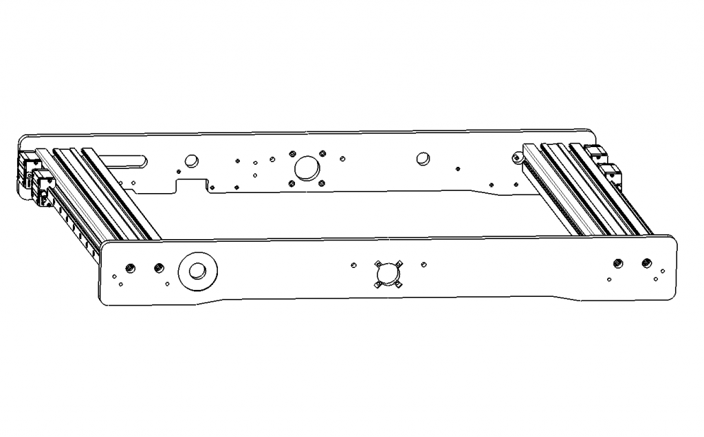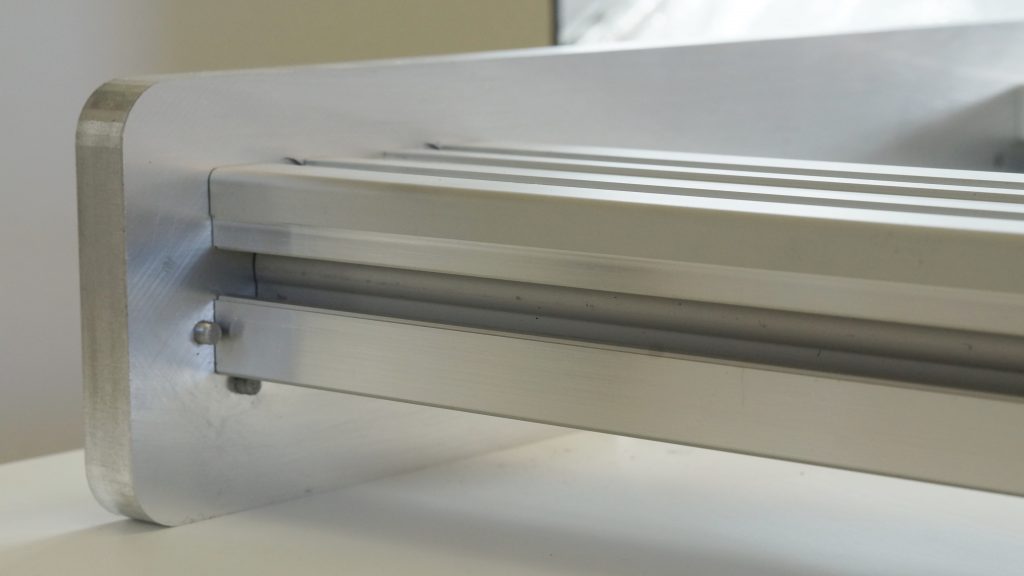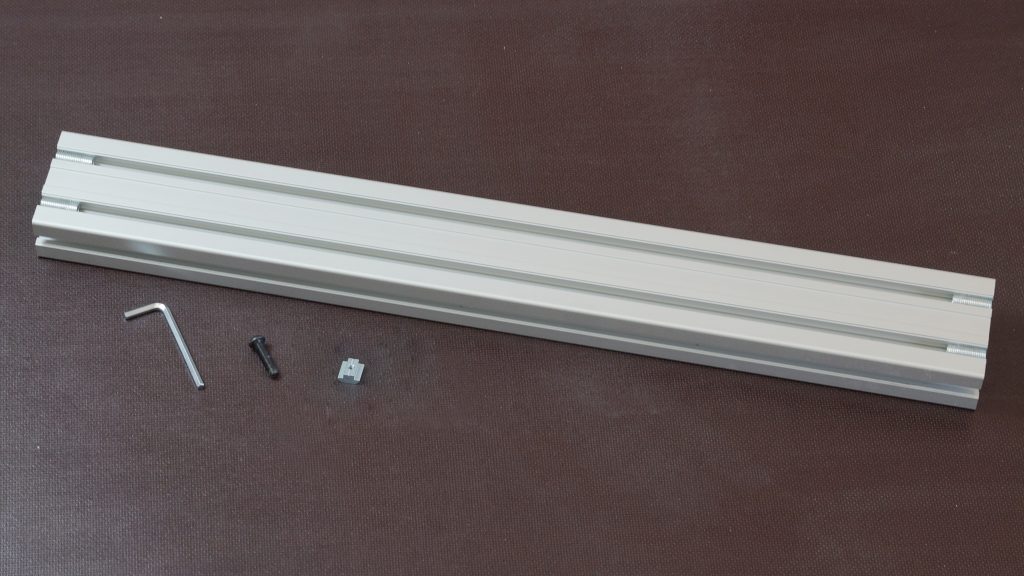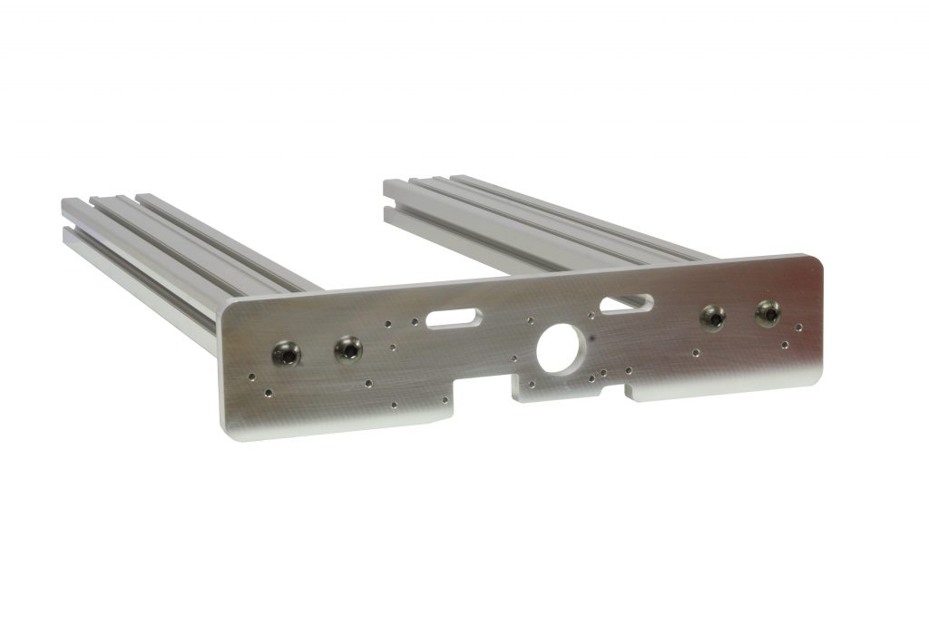 Legen Sie das Aluminiumprofil auf den beiden unteren Passtiften auf. Aufdem seitlichen Passtift liegt später die Führung auf. Zwischen dem seitlichen Passtift und dem Aluminiumprofil ist ein kleiner Spalt (~0.5mm) eingeplant – die beiden Aluminiumprofile werden später durch das Y Portal genau ausgerichtet.