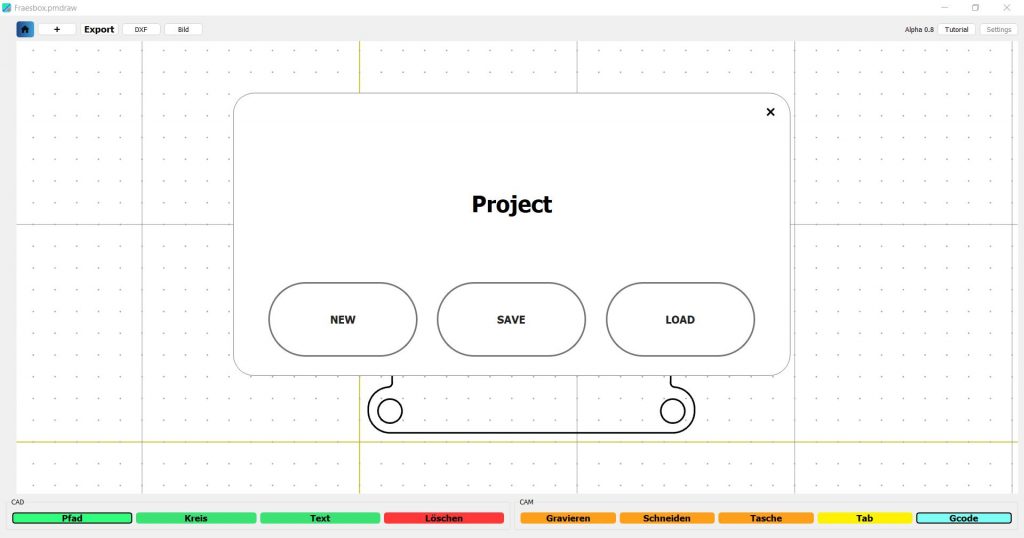 By clicking on the “+” button you can create, save or load projects. Save your drawing regularly.